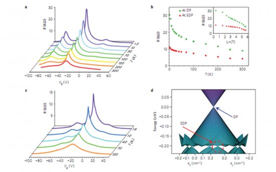 图3:石墨烯/六方氮化硼的电学输运随温度的变化曲线,超晶格狄拉克点的出现以及相应的能带结构。