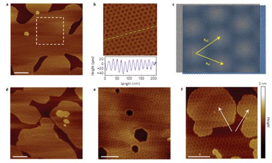 图2:通过AFM表征可以清晰地在各种不同生长阶段的样品观测到~15nm的石墨烯二维超晶格结构。