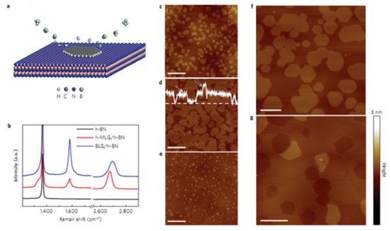 图1:石墨烯在六方氮化硼上的外延生长示意图以及AFM、拉曼的表征。