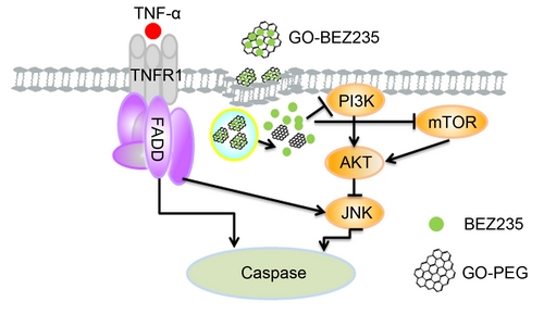 临床上联合给药能够减少药物的多药耐药性、增强药物的协同抗肿瘤效果。该课题组曾经开展了氧化石墨烯联合递送抗癌药物DOX和喜树碱、DOX与肿瘤抗凋亡蛋白Bcl2靶向的siRNA的工作(Small, 2010, 6, 537-544; Small, 2011, 7, 460-464)。最近他们发现,通过PEG修饰氧化石墨烯有效负载难溶性的蛋白激酶抑制剂BEZ235,与肿瘤坏死因子TNF-α联合作用后,对PIK3CA突变细胞系HCT 116能引起其G1期阻滞和肿瘤细胞细胞凋亡。他们还进一步研究了联合载药治疗肿瘤机制,发现细胞凋亡主要是由于联合用药引起JNK磷酸化水平增加,及caspase-8的激活,进而激活caspase-9以及caspase-3(图2)(Journal of Materials Chemistry B, 2013, DOI:10.1039/C3TB20764A)。