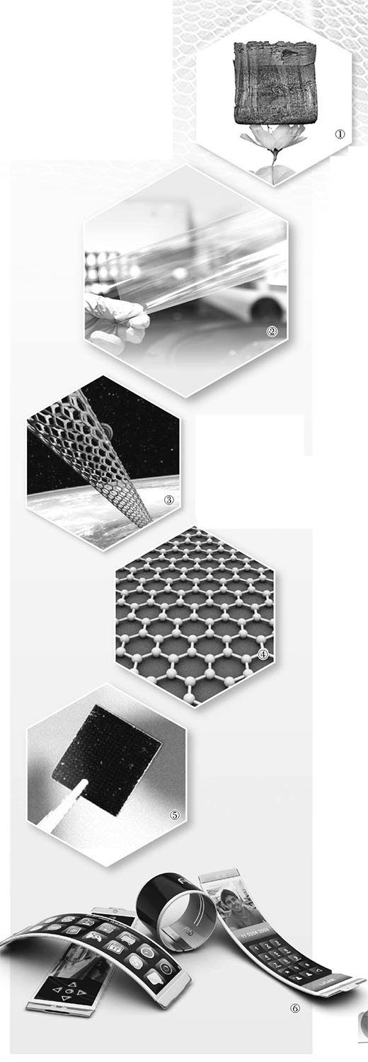 图①:石墨烯是目前已知的世上最轻的纳米材料。图为一块“碳海绵”被放在一朵樱花上。图②:可用来复合石墨烯的柔性基底材料。该材料研制成功意味着可弯曲电视电脑将成现实。图③:石墨烯可制造太空电梯。图④:石墨烯原子结构图。图⑤:石墨烯制成的低功耗发光面板。图⑥:应用石墨烯可制成超薄可折叠手机。