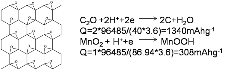 于是我马上去尝试原电池的可行性,将GO粉体和导电炭黑混合涂覆在金属网上作为集流体,另一端是用锌片,在KOH电解液中,外接LED灯后,灯泡果然亮了!当然这要感谢现在的LED技术进步,所以现在0.7V以上就可以点亮LED灯了。不管怎么说,这个想法是可行的。于是我又认真分析了下,理想状态的氧化石墨C2O理论比容量高达,如果说可以达到制备出这种状态的氧化石墨或许将成为高效的电池正极材料。
