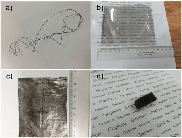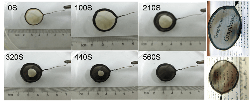 想通了这一点之后,眼前就豁然开朗了,很多类型的GO结构材料都可以通过点或者是线的接触达到高效的电化学还原效果。比如说,我当时在眼镜片的曲面上涂了一层GO薄膜,可以通过边缘与银丝的点接触就能将整个曲面上还原成半透明的还原石墨烯;再比如,我们可以直接将银丝穿插绕缠在浸渍了GO的海绵上,就可以电化学还原出有弹性性的导电石墨烯海绵了。这种方法在薄膜材料的加工尺度上很容易就能够达到分米以及米的级别,只要电解池够大放得下就行。