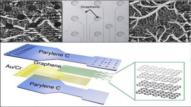 传统的金属电极的技术(左上)会阻碍神经组织的视野。由DARPA的RE-NET计划所资助开发的新的石墨烯传感器技术是可以导电的,且只有4个原子厚,比目前的触点薄数百倍(上中)。这种极薄的厚度使几乎所有的光可以穿越很宽范围的波长。放置在一块与组织形状相符的柔性塑料里衬上之传感器(下方)是概念验证工具的一部分,它展示出了更小、更具透光性的触点,且可同时使用电气和光学方法来对神经组织进行测量与刺激(右上)。
