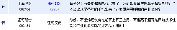 江海股份(002484)周二在全景网互动平台解答投资者询问时表示,石墨烯还没有在超容上真正应用,而锂离子超容是目前技术性能和产业化最实际的好产品。