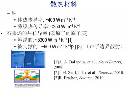 在石墨烯散热需求方面,刘教授从LED功率模块、微系统的RF功率器件、航空电子功率器件与系统、汽车的功率模块等大功率半导体器件散热需求切入,讲了散热的重要性。由于石墨烯具有高导热率,其热传导率远远大于导热性能最好的金属铜,因此在散热方面被寄予厚望。