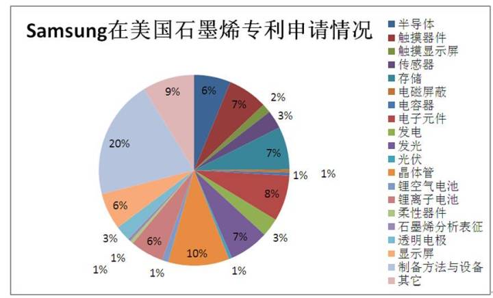 根据笔者在美国专利局网站上截止到2015年5月的初步检索结果,三星相关的石墨烯专利共有193件,经初步分析发现(此部分结果仅是个人的分析,不代表任何官方以及三星的立场):大部分集中在制备技术(39件),晶体管(20件),触摸器件、显示屏等方面。而锂离子电池、锂空气电池、超级电容累加起来也只有11+2+1=14,占总量(193)的7%左右。经过进一步分析发现,在这14项专利中,近一半专利里石墨烯都只是在文中出现了1-3次,并不是技术的主要内容,而其它真正使用石墨烯的专利里大多也只是制备了石墨烯与正负极材料的复合电极,并没有特别的技术特点以及明显专利布局目的。可见相比于电池储能领域,三星更侧重于关注石墨烯的CVD制备方法,以及其在显示器,柔性、可穿戴器件上的应用。