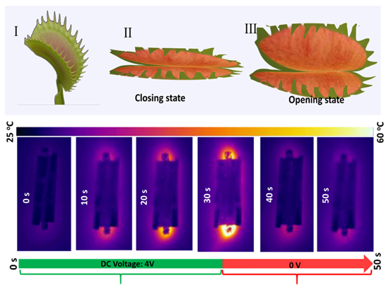 东华大学的王宏志教授课题组通过对捕蝇草捕食过程的观察和分析,利用改性石墨烯易组装的特性,制备了能模仿捕蝇草叶片开口和闭合的电致动氧化石墨烯基材料。科研人员以化学改性石墨烯和金为原料,通过简单的热蒸发氧化石墨烯溶液制备多孔结构的氧化石墨烯薄膜,进一步使用高真空电阻热蒸镀方法制备了金/氧化石墨烯非对称薄膜,该薄膜表现出优异的电致动性能。同时,通过加掩模和激光雕刻技术制备出图案化的电致动薄膜。