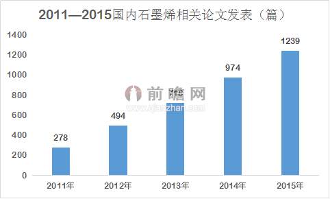 技术研究方面,2011年,国内与石墨烯有关的论文为278篇,2012年为494篇,2013年为718篇,2014年上升至914篇,2015年为1239篇;技术专利上。目前我国在国际上已经申请2200多项石墨烯专利技术,约为全球石墨烯专利技术的三分之一。