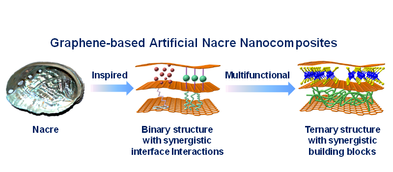 石墨烯是目前测得的强度和韧性最高的材料,而且是已知导电性最强的材料,因此在很多领域特别是纳米复合材料方面具有很大的应用前景。鲍鱼壳是仿生纳米复合材料构筑的“黄金准则”,为二维纳米材料组装高性能纳米复合材料提供了重要的启示。仿生构筑策略突破了传统纳米复合材料制备方法的瓶颈,解决了纳米材料分散性差、含量低、界面相互作用弱等一系列技术问题。这篇综述具有非常重要的指导意义,总结归纳了近期石墨烯基纳米复合材料的代表性工作,主要集中在如何通过界面设计和协同作用仿生构筑高性能石墨烯纳米复合材料。