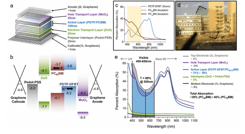 图1 a)器件结构 b) 不同层的能级 c) 活性层PDTP-DFBT、PC60BM以及PC70BM的吸收 d)穿过器件的照片 e) 器件累积的吸收,阴影部分是每层对于可见光的吸收。图片来源:Adv. Energy Mater.