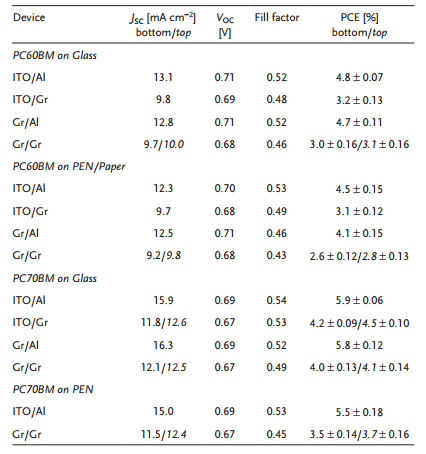作者又利用透明塑料PEN作为基板制备了柔性器件。像PEN这类柔性基板比玻璃更加便宜,而且可弯曲的器件也更受市场欢迎。转移到PEN上的石墨烯,其薄层电阻比在玻璃上更大,这就导致了更大的串联电阻。而且,PEN粗糙度更大,就具有更多短接通路。这些就导致了其器件性能填充因子的下降。而且,由于PEN比玻璃拥有更高的截止波长,从底部照射其短路电流也会更低。