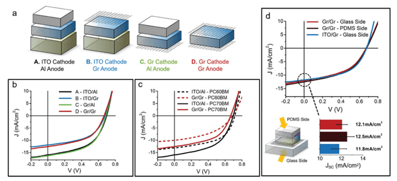 如图2a所示,作者对比了不同的器件结构,详细的器件性能如表一所示。一方面作者考察了石墨烯代替常规器件的阴极或阳极(或者代替阴极和阳极)的器件性能,另一方面每组器件又分别选用PC61BM或者PC71BM作为活性层的受体材料。从各组数据来看,阴极与阳极均用石墨烯作为电极,其光电转换效率最低。总体上,ITO/Al与Gr/Al器件的差别非常小,Gr/Al器件由于石墨烯更好的光学透光性,具有略高的电流,但是由于石墨烯的薄膜电阻较大因而填充因子较低。