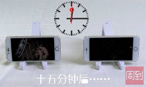 实验中,测试者拿来两部相同的iPhone手机,起始温度基本一致(27.6℃),然后播放同一部高清视频。