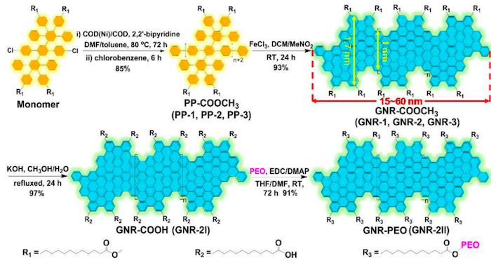 良好的分散性不仅为更深层次理解GNRs的物理化学性能提供了可能,还有很好的发展前景。因此,聚合物功能化提供了GNRs相关研究的发展机会。