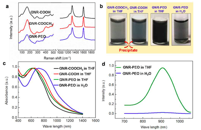 图b表示的是不同功能化基团对GNRs的分散性的影响是不同的。在THF中溶解度可达1mg/mL(GNR为主),且分散稳定保持至少1天。GNR-COOCH3和GNR-COOH不能均匀分散在四氢呋喃中,超声之后几分钟就会看到沉淀。GNR-COOCH3和GNR-COOH在THF中的最高溶解度分别为0.02 mg/mL,0.05 mg/mL. 由此作者得出,PEO-GRN在常规溶剂中有着良好的分散性。