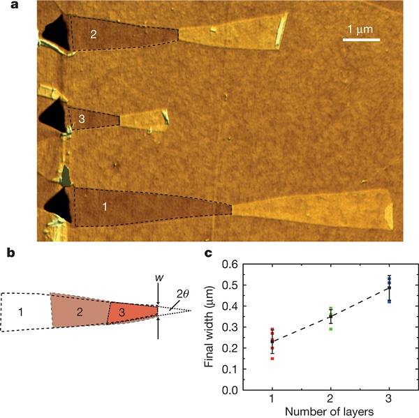 他们当时正在测试层状材料在加热到150℃之后的摩擦性能,突然发现一个小型、花朵外形的缺陷。进一步研究披露,该缺陷是因为原始层上一个孔引起的。这个团队就很好奇呀,然后就要再重复一下呀,就加热另一个石墨烯层,然后利用一点钻石,具有一个锋利的三边的顶端。研究者观察到,随着孔附近的材料自发向后剥皮,产生了三个小的石墨烯丝带,平躺在原始表面上。天啊,我的天啊,我的个乖乖隆地洞咚咚个天呀,这是形成了石墨烯丝带吗?研究者相当激动,不是在天然态的孔,条状物越长越宽。在一个测试中,他们记录道,单个丝带近似于0.6微米,在最薄的末端,成为一个15度的锥形角–他们另一端生长到宽度大约1.5微米。他们报道,用尖端摩擦新做的孔允许他们控制剥皮到一个较小的程度。