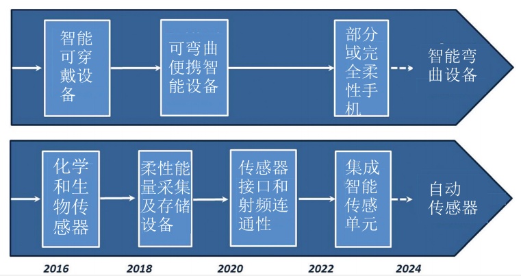 2015年欧盟石墨烯旗舰计划石墨烯技术路线图预测了未来10年石墨烯在电子信息应用的发展。在新技术的推动下,未来10年,电子信息的发展方向将是柔性智能电子产品。同时,柔性电子也将与柔性智能传感相结合,从而最终发展成为柔性智能电子产品,具体时间参照图4。