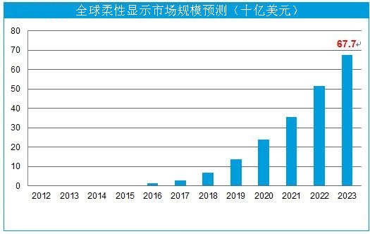 未来,柔性显示市场不仅取代现有显示市场,还将产生新的显示应用市场。IHS Electronics & Media(E&M)预测报告显示,替代产品市场将从2016年的9000万美元增加到2023年的328亿美元,新型市场将从2016年的4000万美元增加到2023年的349亿美元。