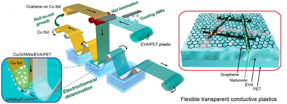 2015年,北京大学纳米化学研究中心成功制备出高品质石墨烯/PET柔性塑料电极,并在此基础上批量制备了石墨烯/金属纳米线/PET的复合型柔性导电薄膜。其在恶劣的工作环境中显示出优良的耐久性能,在下一代柔性电子和光电子领域有重大的潜在应用价值。此外,他们还创造性的使用卷对卷连续快速生长石墨烯薄膜的方法,并开发了卷对卷热压印—电化学快速鼓泡转移方法(如图3所示),实现了石墨烯从铜箔生长基底直接向工业用PET柔性透明塑料基底的连续化无损转移,从而制备了高品质石墨烯/PET柔性塑料电极。在此基础上,研究人员在石墨烯快速转移过程中,将金属纳米线(银纳米线、铜纳米线等)网络直接封装在石墨烯与柔性塑料基底之间,批量制备了石墨烯/金属纳米线/PET的复合型柔性导电薄膜。