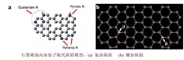 面内杂原子取代缺陷:一些原子如氮、硼等,可以形成三个化学键,因此可以取代石墨烯中碳原子的位置,这些杂原子构成了石墨烯面内杂原子取代缺陷。