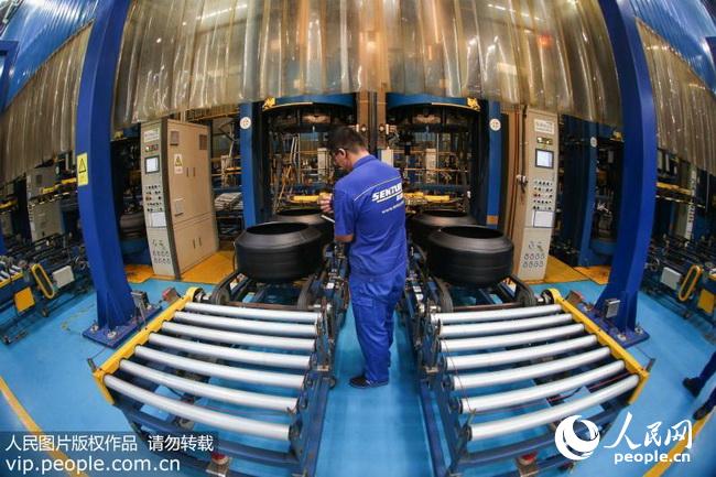 2016年9月14日,世界首条石墨烯导静电轮胎生产线——“森麒麟—华高墨烯”导静电轮胎智能化生产线在山东青岛正式投产运行,这标志着石墨烯材料在轮胎行业首次实现了产业化。该产品通过在轮胎制造环节应用石墨烯原料和工艺,使轮胎胎面接地过程同步实现静电导出,使车辆无需额外增加车载导静电设备,有效降低安全风险。同时,轮胎散热、强度等物理性质也因石墨烯的特殊属性而得到较大提升,因此在民用汽车尤其是易燃易爆品运输车、电子设备专用车、军﹙警﹚防暴车等特种车辆领域有着广泛应用前景。(解豪/人民图片)