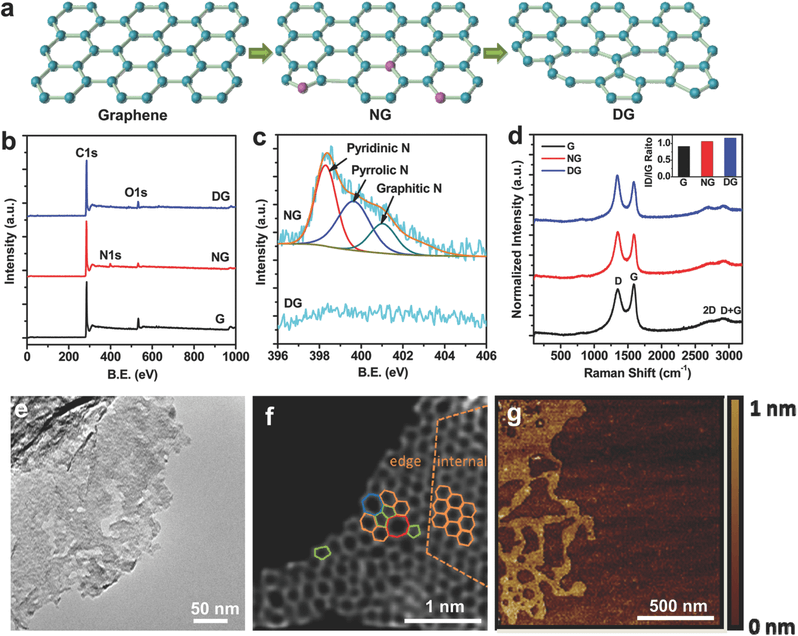 原理图中可以看到碳原子重组后出现了各样的缺陷,包括五角形、七角形、八角形。XPS图中可以看到N1s峰在NG形成DG过程中成为缺陷,高分辨率分析三个主要峰对应于吡啶,叽咯,石墨氮。拉曼显示了DG和NG杨品的D带和G带有明显不同的强度。在DG材料表面明显可以看到孔洞的缺陷且是由于氮移除而产生的,HAADF更加清晰地看出缺陷的不同组成,并不是单一的,而是具有不同结构的缺陷,AFM突出了掺杂氮原子的移除导致了石墨烯结构的局部破坏。