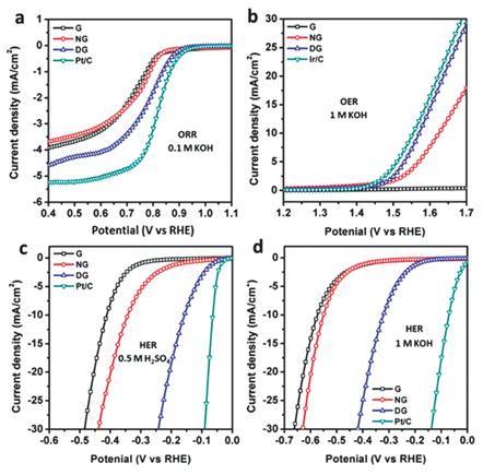 由四个反应可以得到结论,DG材料的功能性不仅仅表现在氧还原反应中,而且还包括氧产生和氢产生反应中,DG材料的活性相比于NG在三个基本的电化学反应中都有显著的提高。