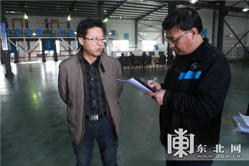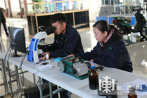 华升石墨烯股份有限公司技术人员高悦(右)在测试石墨烯润滑油。东北网记者 许俊鹏 摄
