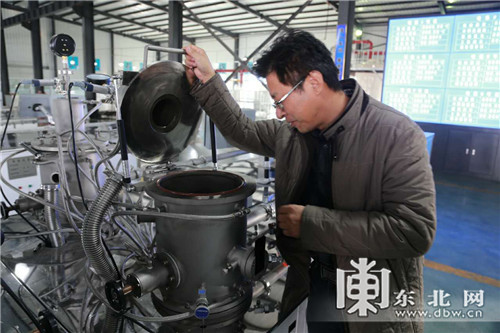 哈尔滨工程大学材料科学与化学工程学院曹殿学院长观察电弧反应石墨烯装置。东北网记者 许俊鹏 摄