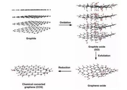 氧化-还原法是指将天然石墨与强酸和强氧化性物质反应生成氧化石墨(GO),经过超声分散制备成氧化石墨烯(单层氧化石墨),加入还原剂去除氧化石墨表面的含氧基团,如羧基、环氧基和羟基,得到石墨烯。