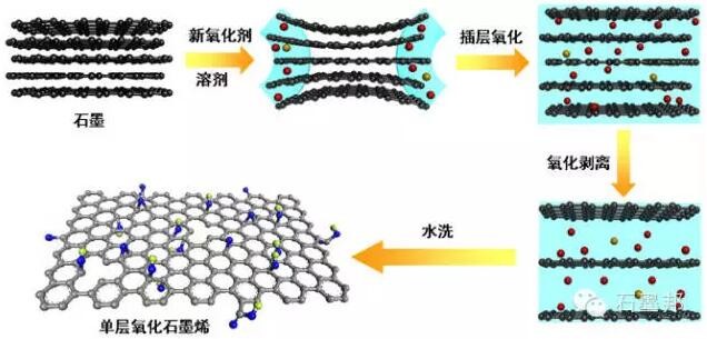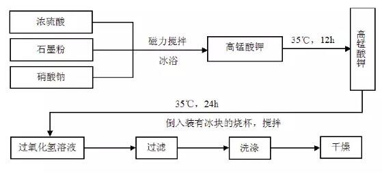氧化石墨的方法主要有三种:第一种是Hummers法,第二种是Brodietz法,第三种是Staudenmaier法,他们首先均是用无机强质子酸例如浓H2SO4、发烟HNO3或者它们的混合物处理原始的石墨粉原料,使得强酸小分子进入到石墨层间,而后用强氧化剂(如高锰酸钾、KClO4等)氧化。