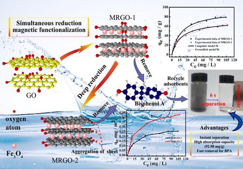 基于实验结果,科研人员提出其作用机理:在石墨烯材料吸附双酚A的过程中,π-π作用起主要的作用;经过深度还原后的氧化石墨烯,其对双酚A吸附容量的降低是由于石墨烯片层的聚合减少了吸附位点。此外,实验结果还显示,磁功能化后的还原氧化石墨烯,可以通过外加磁场快速回收,经再生后多次反复使用,为大规模工业化应用打下了基础。