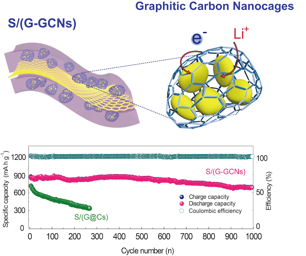 近期,中国科学院化学研究所郭玉国教授课题组开发出一种独特的石墨化碳纳米笼结构的sp2型碳材料,并将其作为硫载体,应用在高倍率长寿命锂硫电池。该碳材料具有三维夹层结构,由石墨烯作为骨架,周围包覆sp2型碳层,碳层中嵌有石墨化碳纳米笼结构单元。该石墨化碳纳米笼由几层石墨化sp2碳包围形成,内部空腔直径约为3~5 nm。采用溶液法将纳米硫负载入石墨化碳笼单元内。该结构作为活性硫的微型电化学反应器具有较大的孔体积,在高硫负载量(77wt%)情况下,不仅可以实现纳米硫的高效分散、充分发挥其电化学活性,还可以有效抑制多硫化锂的溶解穿梭,改善锂硫电池的循环性能。此外,石墨烯骨架和高度石墨化的纳米碳笼共同组建了一个高导电、结构稳定的三维sp2碳导电网络,不仅有利于电子的高速传输,同时可保证正极结构的稳定性。该硫碳复合正极0.1 C电流密度下,可发挥1375 mAh/g的比容量,并在循环200次后,容量维持在943 mAh/g;1 C电流密度下循环1000次,容量保持率高达78.4%。与此同时,该电极材料具有优异的高倍率性能,在5 C的电流密度下,容量仍可达765 mAh/g。