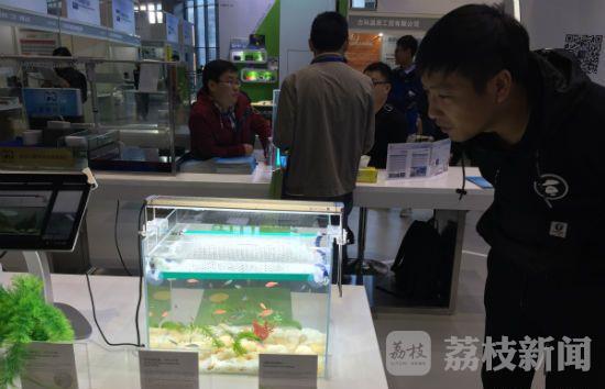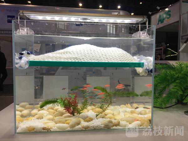 和很多“高大上”的参展产品不同,现场只见一个鱼缸里,数十只鱼儿围绕着几丛非天然的水草欢快地游动,水体十分清澈,鱼缸底部的小石子一览无余。和普通鱼缸唯一不同的是,水面的上方多了一层白色的网状物,这也引起现场围观者的好奇。