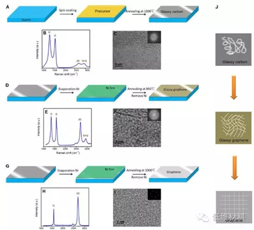 具体来说,为得到这种“玻璃石墨烯”材料,研究者将前驱体制成水溶液,旋涂于玻璃基底上,然后在保护气氛下热处理(1000℃),得到玻璃碳;然后在碳层上蒸镀一层金属镍,在850℃下二次热处理,即可得到“玻璃石墨烯”。作者将这种方法称为“聚合物辅助沉积”(PAD)法。