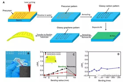 研究者对这种材料进行了结构、性能上多方面的测试。结果表明,“玻璃石墨烯”的表面极为光滑;Raman光谱显示其既具有良好的石墨烯结构(明显的2D峰),又具有区别于完好石墨烯的一些结构缺陷(相对较高的D峰);透射电子显微镜则更直观地展示了“玻璃石墨烯”的扭曲但有序的结构。以面电阻的变化率为检验参数,测试了“玻璃石墨烯”的抗震、耐蚀、耐热性能,材料在测试中表现良好。采用激光直写技术代替第一次热处理,可以得到具有清晰的“玻璃石墨烯”图案,将其转移到柔性基底上,可以进一步制成柔性电子器件。