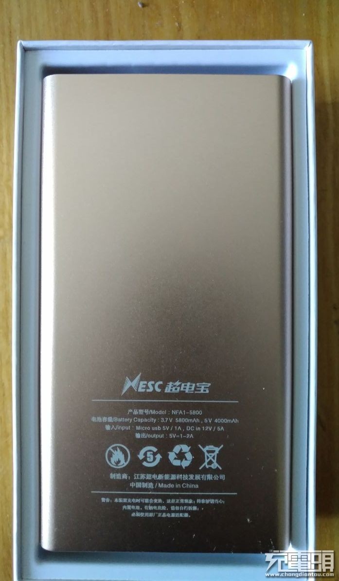 移动电源正面印着NESC四个大字,香槟金颜色还不错。印字摸起来应该不是激光刻蚀,而是印上去的。