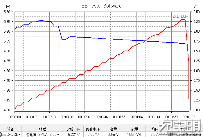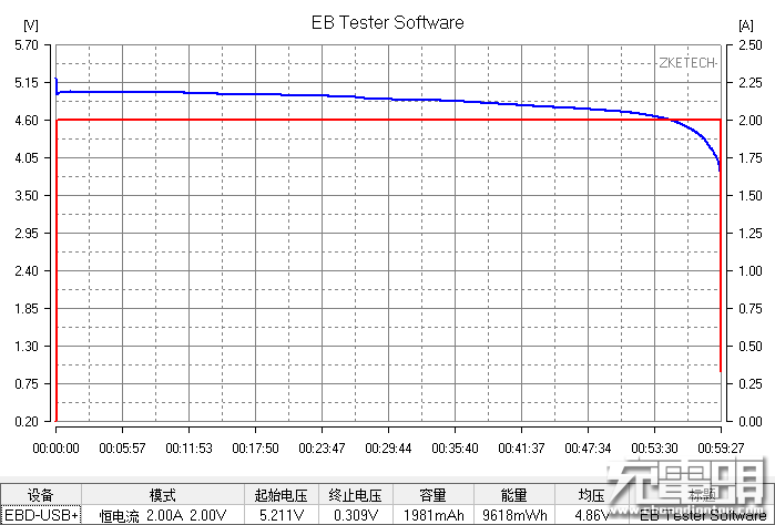 移动电源的放电能力测试采用EBD-USB+测试USB输出口的放电能力: