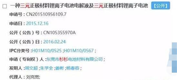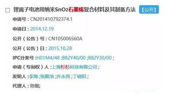 专利局相关数据表明:华为此次宣布的石墨烯基锂离子电池的两项关键技术:单晶三元材料和石墨烯材料的专利拥有者均为杉杉集团旗下子公司。