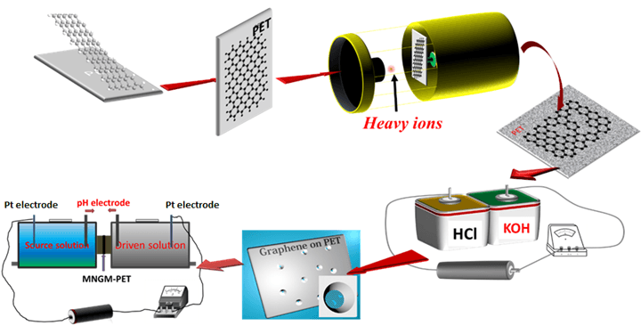 石墨烯作为二维碳纳米材料,被广泛应用于能源电子、生物医药和化工材料等领域。目前,多位科学家根据理论计算预言单原子层石墨烯将有可能作为一种金属离子的选择性过滤膜而用于海水淡化、污水处理、能源电池领域。但是纳米孔石墨烯过滤膜的制备是个难题:首先是如何制备出亚纳米尺度的石墨烯纳米孔,其次是需要选择一种离子可自由穿过的基底材料来增加石墨烯过滤膜的可加工性和机械性能。