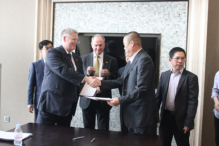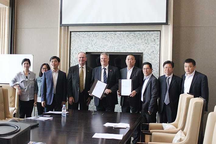 华升公司董事长单永宝与南澳大利亚大学校长举行签约仪式(左起依次为华升公司副总经理李丽娟、华升公司技术主管马丽春博士、南澳大利亚大学未来工业研究所资深研究员,Haolan Xu先生、南澳大利亚州投资和贸易部部长,Hon Martin Hamilton-Smith先生、南澳大利亚大学校长,Robert Vink先生、华升公司董事长单永宝、南澳大学商务经理,J.C chen先生、青岛华升石墨烯研究院总经理曹殿学先生、哈尔滨工程大学青岛船舶科技园副主任,王臣业先生)
