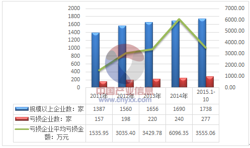 2011-2015年10月我国合成树脂制造行业企业亏损情况