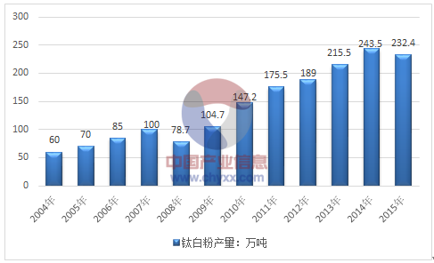 据统计,2015年全国钛白粉生产企业约67家,能维持正常生产的46家规模以上的全流程型钛白粉生产企业(含38家硫酸法企业、3家氯化法企业,1家兼具硫酸法/氯化法企业,不含表面处理加工型企业)的数据统计,2015年以上企业的钛白粉生产总量为232.37万t,相比2014年的243.5万t下降11.13万t,这是自1998年以后至2015年的17年间首次出现的全行业总产量下降(2008年下半年短暂期的下降除外)。