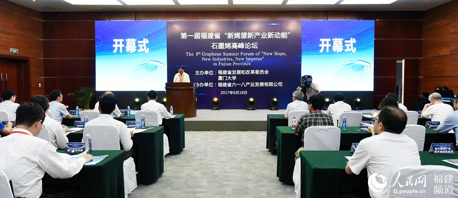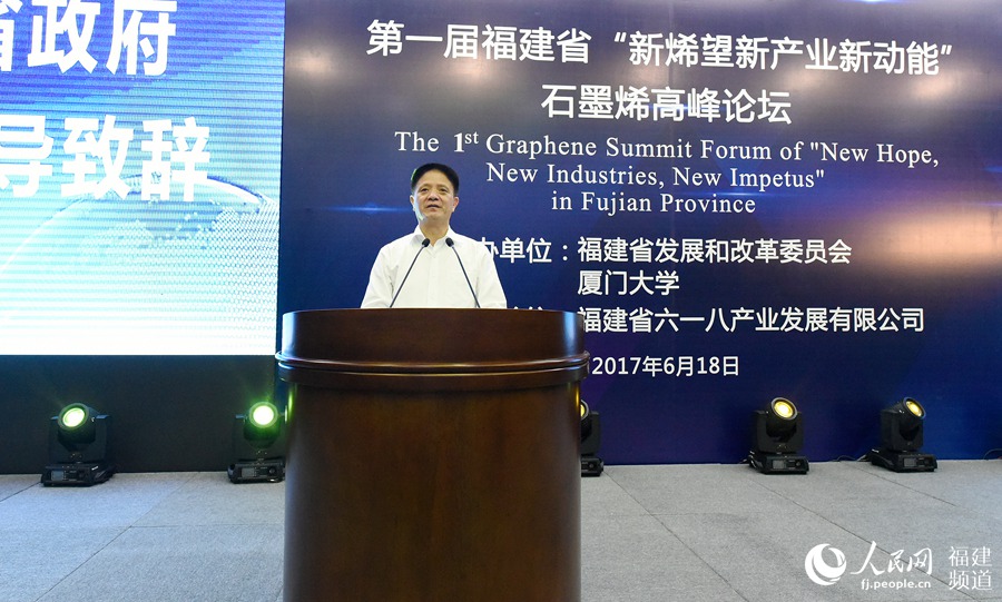 人民网福州6月19日电(余杉芳)18日下午, 在中国·海峡项目成果交易会(简称“6·18”)上,第一届福建省石墨烯高峰论坛开幕。本次高峰论坛由福建省发改委、厦门大学联合主办,以“新烯望、新产业、新动能”为主题,吸引了省内外近百家行业重点企业、高校和科研院所积极参与。福建省委常委、常务副省长张志南出席活动并发表重要讲话。