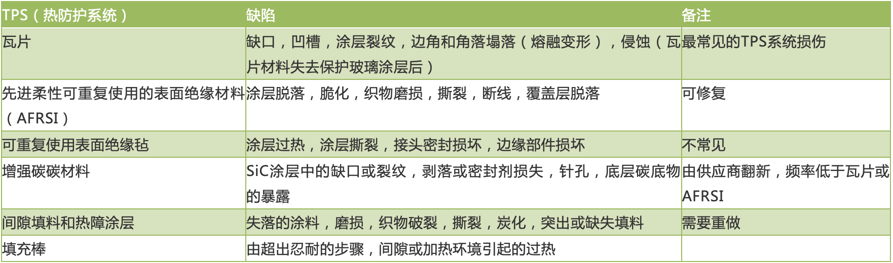 航天飞机轨道器使用的TPS是唯一证明是可重复使用的TPS,为开发RLV TPS提供了宝贵的经验。铝合金轨道器结构已经成功地保持在温度范围内,粘结附着的方法可以防止热量直接渗入结构。然而,如TPS损伤的详细评估(表1)所示,涵盖轨道飞行器各个部分的TPS系统暴露于超出其真正重用限度的温度,会导致脆化,边缘塌陷,过热,开裂并剥落涂层的现象。并且辅助TPS系统(例如,间隙填料,热障涂层,填料条)的损坏特别高。指定的轨道飞行器TPS再利用温度(表2)显然太高,因为暴露的材料发生了不可逆变化。此外,额外的损坏是由起飞和着陆的碎屑(碎屑,沟槽)以及气流和压力梯度(侵蚀,织物磨损和撕裂,缺口填料)造成的。
