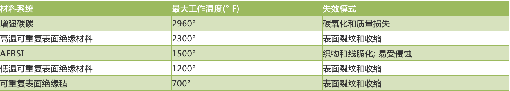 表2 航天飞机的最高工作温度