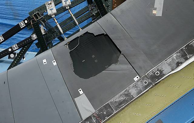 图4. RCC前沿面板上的一个孔,是哥伦比亚航天飞机灾难调查中的冲击测试的结果。聚氨酯泡沫用于以850公里/小时的速度冲击机翼。 图片来源:Wikimedia Commons / Colombia Accident Investigation Board