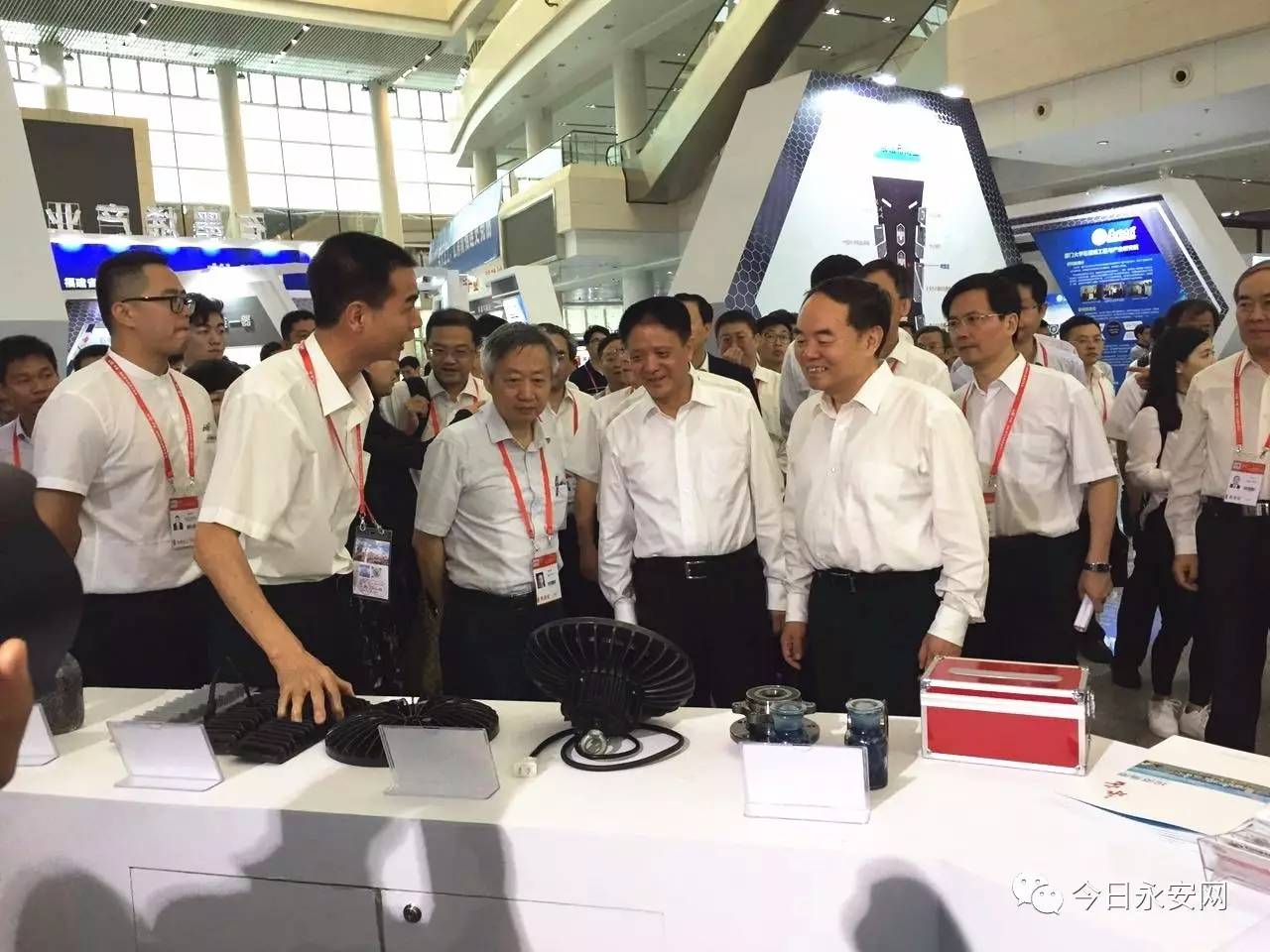 图为中国工程院院长周济,省委常委、常务副省长张志南参观永安石墨烯展区