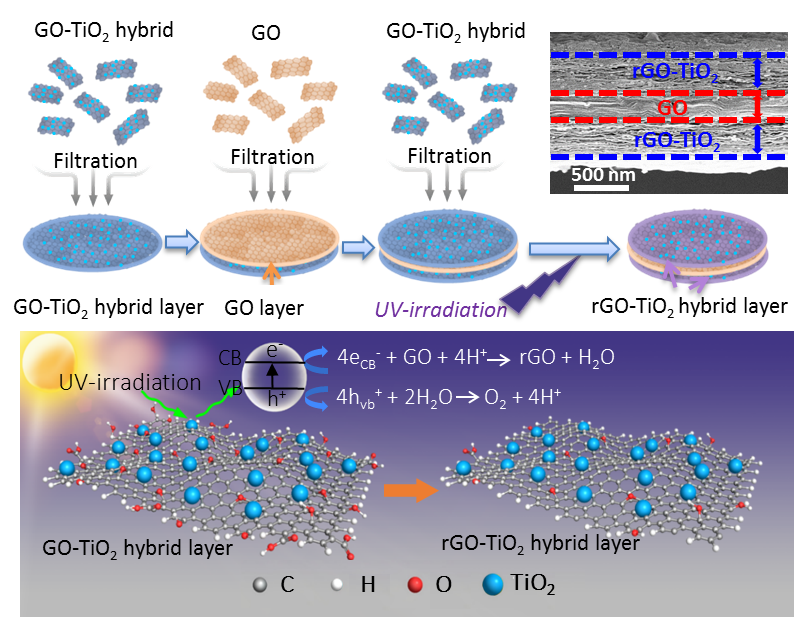 近期,清华大学深圳研究生院和天津大学先进碳/纳米能源材料联合团队通过连续抽滤氧化石墨烯(GO)-TiO2分散液、GO分散液和GO-TiO2分散液,首先获得具有良好柔性的GO-TiO2/GO/GO-TiO2薄膜,利用TiO2纳米颗粒的光催化特性,在紫外光照射下将GO原位还原成石墨烯(rGO),从而获得了具有三明治结构的rGO-TiO2/GO/rGO-TiO2柔性薄膜。该薄膜可以直接作为一体化的柔性超级电容器并表现出优异的电化学性能,其中两侧的rGO-TiO2层分别作为活性材料,GO层在中间作为隔膜的同时,还可以有效的储存电解液。这种温和的光催化还原过程避免了普通化学还原以及热处理还原等方法对薄膜结构的破坏并保留了三层结构之间良好的界面接触,保证了薄膜在还原后仍具有良好的柔性特征。该器件表现出高体积比容量(237 F cm-3)和体积能量密度(16 mWh cm-3),同时具有优异的柔性,在大角度弯折时仍能保持良好的容量和循环性能。这种一体化超级电容器的结构为柔性储能器件的设计提供了一种新设计思路。相关结果作为封面文章发表在Advanced Materials Interfaces(DOI: 10.1002/admi.201700004)上。